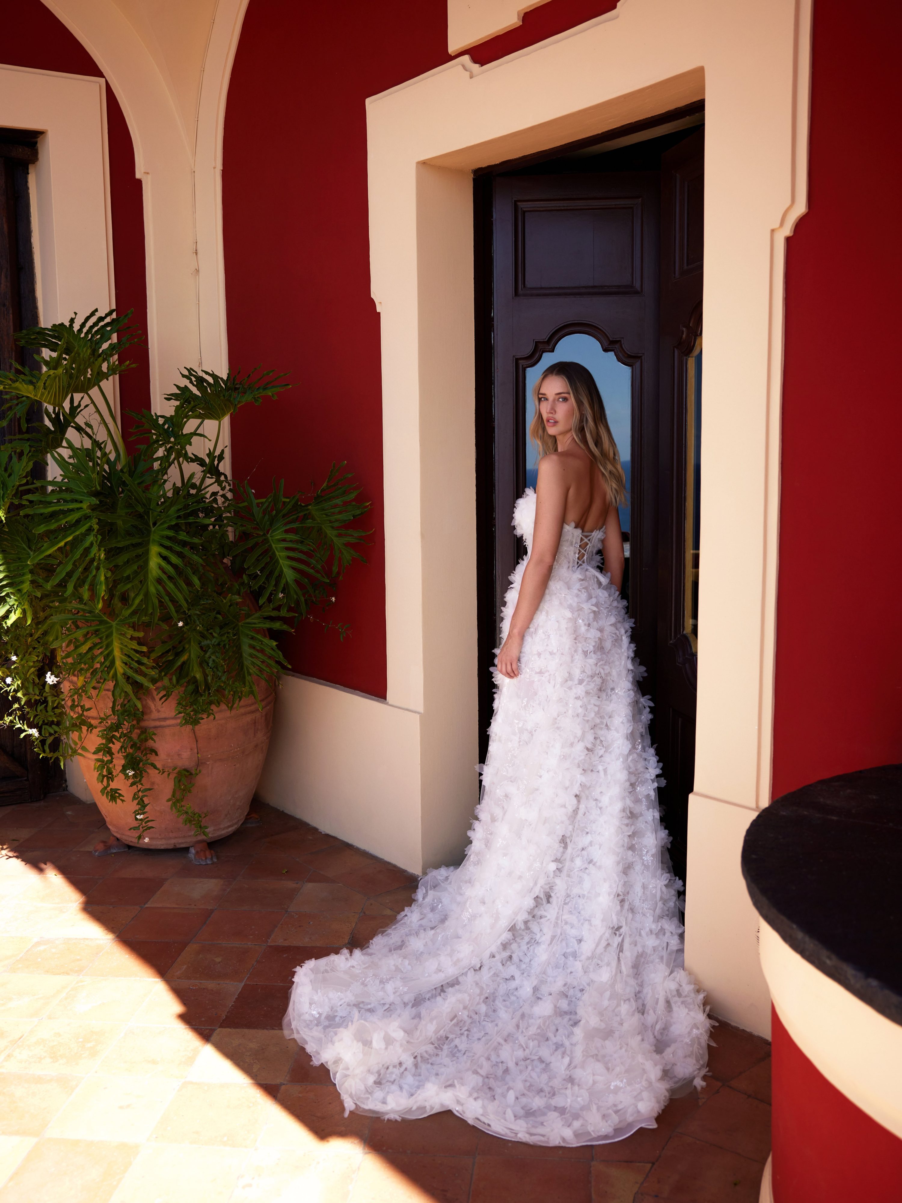 This striking A-line gown is crafted from 3D floral lace, creating a romantic and ethereal look. The design is highlighted by a high slit, adding a bold and confident edge to the delicate floral details. The semi-sheer corset, with its asymmetrical draping, adds a sculpted, flattering fit and a touch of sensual allure.