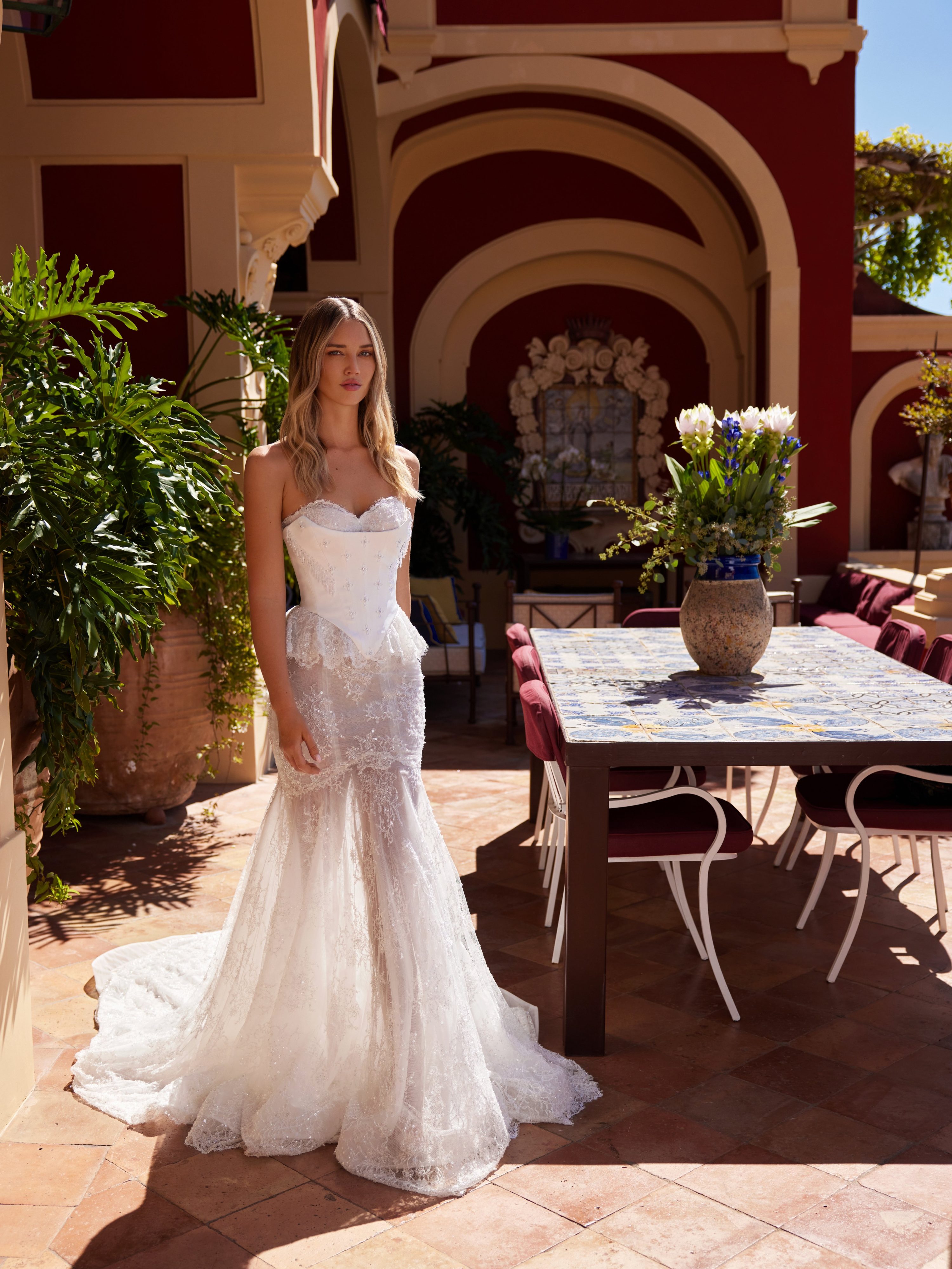 This exquisite gown is crafted from luxurious beaded lace. The design is highlighted by a removable satin corset, adorned with shimmering crystals, and complemented by a lace basque, adding a touch of sophistication and structure. The delicate lace and intricate bead work make this dress a perfect choice for the bride seeking a blend of timeless beauty and modern sophistication, with the option to transform her look by removing the corset for added versatility.